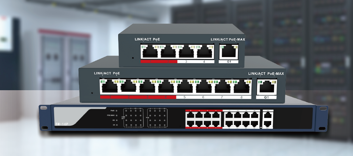 Raysharp PoE Switch supplies power and network connectivity to IP cameras through a single Ethernet cable.